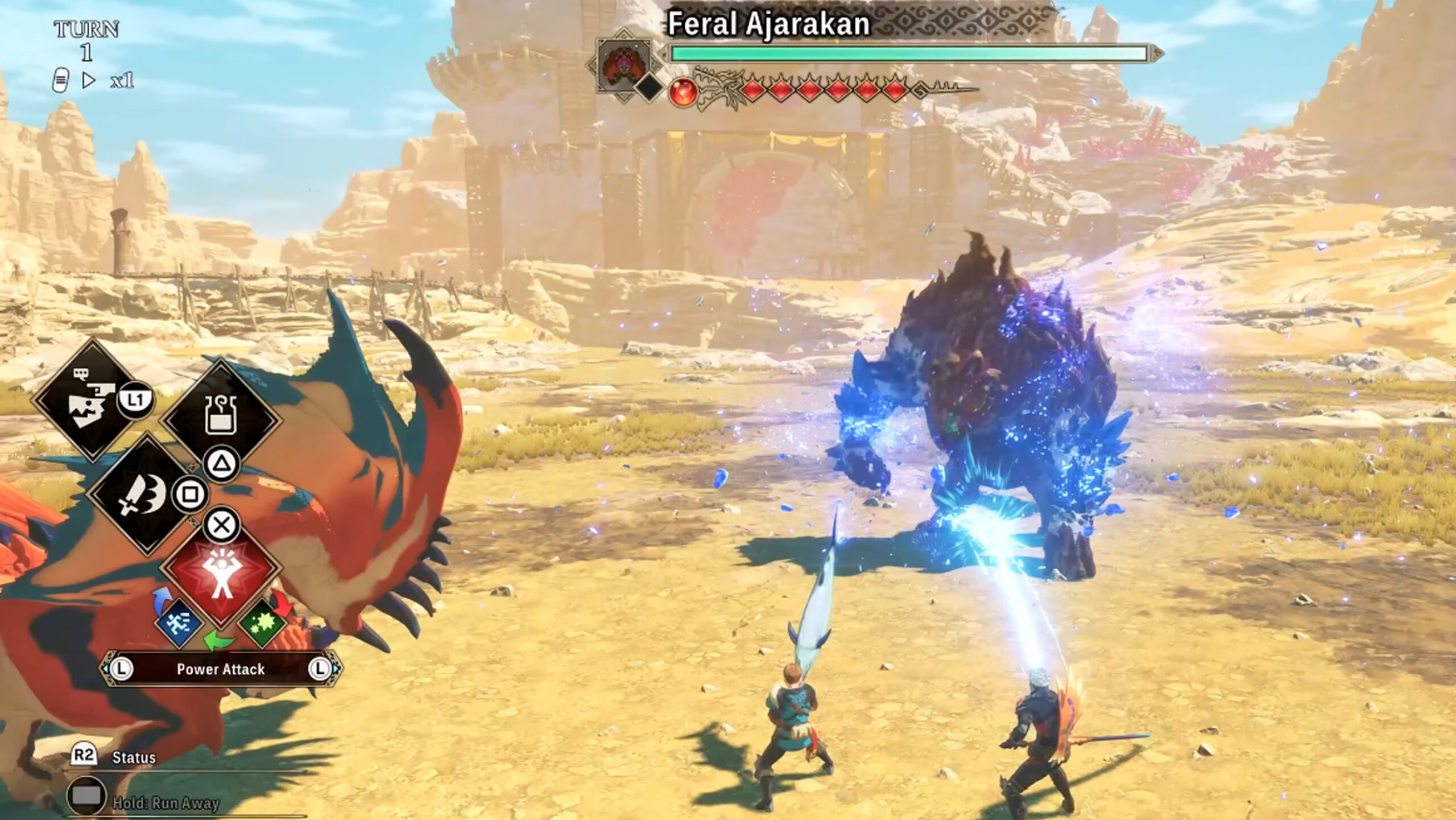 Durante los combates tendremos un grupo de cuatro integrantes: el jugador, un aliado y los Monsties de ambos. Aunque no es posible manejar a los aliados, cada uno se especializa en un estrategia en concreto, ya sea ataque, curación, buffar a los aliados y aplicar estados alterados a los enemigos. Sin embargo, son batallas muy divertidas y vistosas cuando le cogemos el truco. Tras llenar el Indicador de Vínculo, podemos montar nuestra criatura para realizar poderosos ataques vinculados.