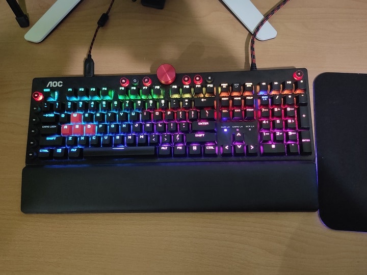 Como todo modelo gaming que se respeta las teclas incluyen iluminación RGB que al parecer no fue el enfoque principal de AOC ya que las luces lucen algo estándar pero debemos tener en cuenta que este modelo está orientado al alto rendimiento en vez de la estética, pero no me malentiendan, ya que el RGB es bastante bueno pero yo me considero algo exigente con las piezas de mi PC. Este modelo también incluye un descansa muñecas que hace que sea bastante cómodo ya que he pasado horas jugando y trabajando sin molestia alguna; yo usualmente he tenido malas experiencias con los descansa muñecas de los teclados ya que vienen hechos en plástico y en mi opinión es lo mismo que nada, pero este tiene una almohadilla lo cual lo hace sentir bastante cómodo y encima de eso es magnético así que no tendrán ningún problema a la hora de ponerlo o quitarlo, solo lo acercan al teclado y listo o lo halan para removerlo.