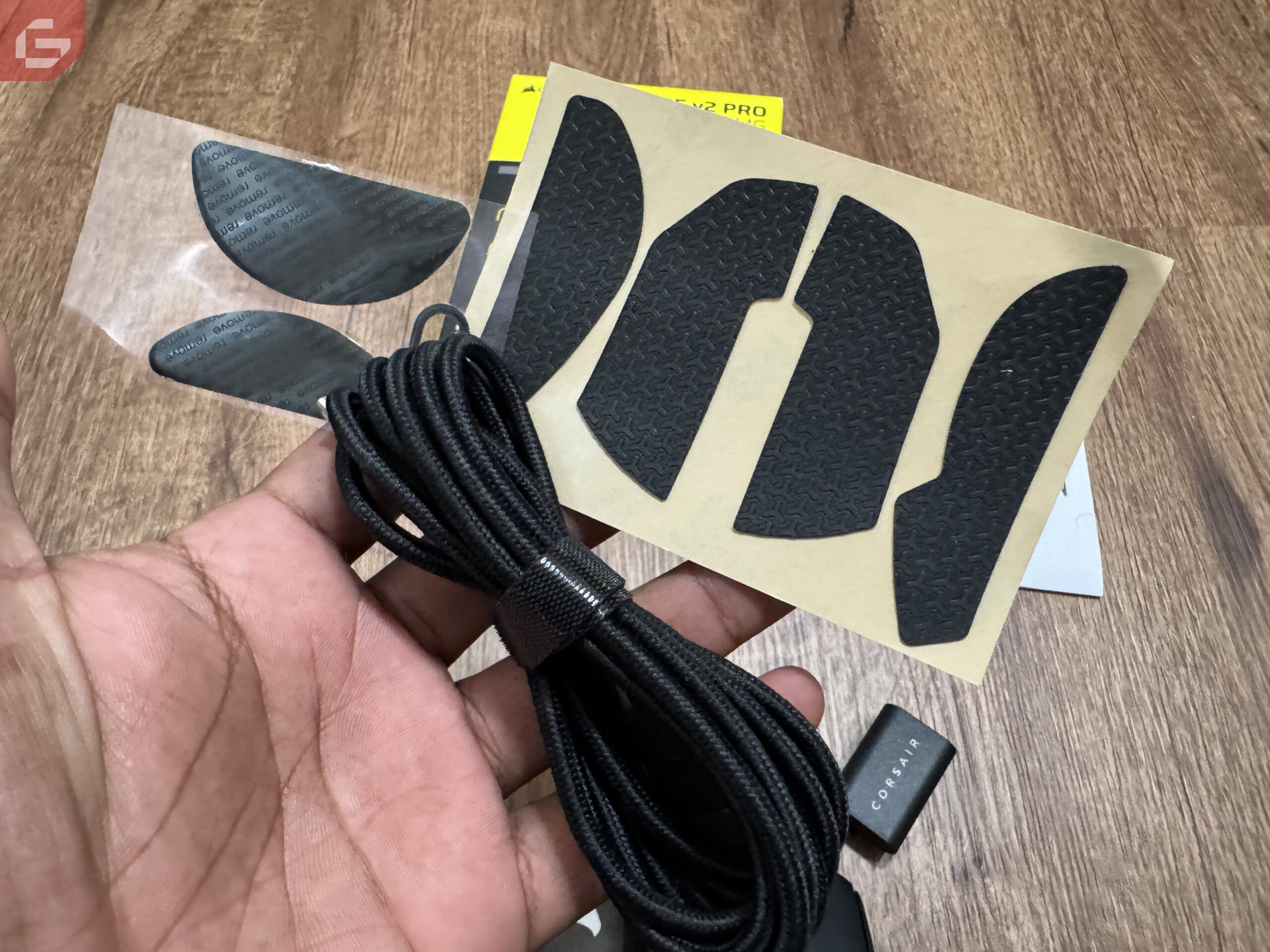 El diseño es atractivo, no voy a mentirles y aunque no es algo innovador si es extraño ver a Corsair lanzarse con este tipo de mouse a este estilo pero siempre tendremos una primera vez para todo. El mouse con unos stickers para mayor agarre y un reemplazo de los skaters también, durante mi etapa de prueba me pude dar cuenta que realmente no lo necesito aunque para largas horas de uso o algo más intenso si son bastante bienvenidos.