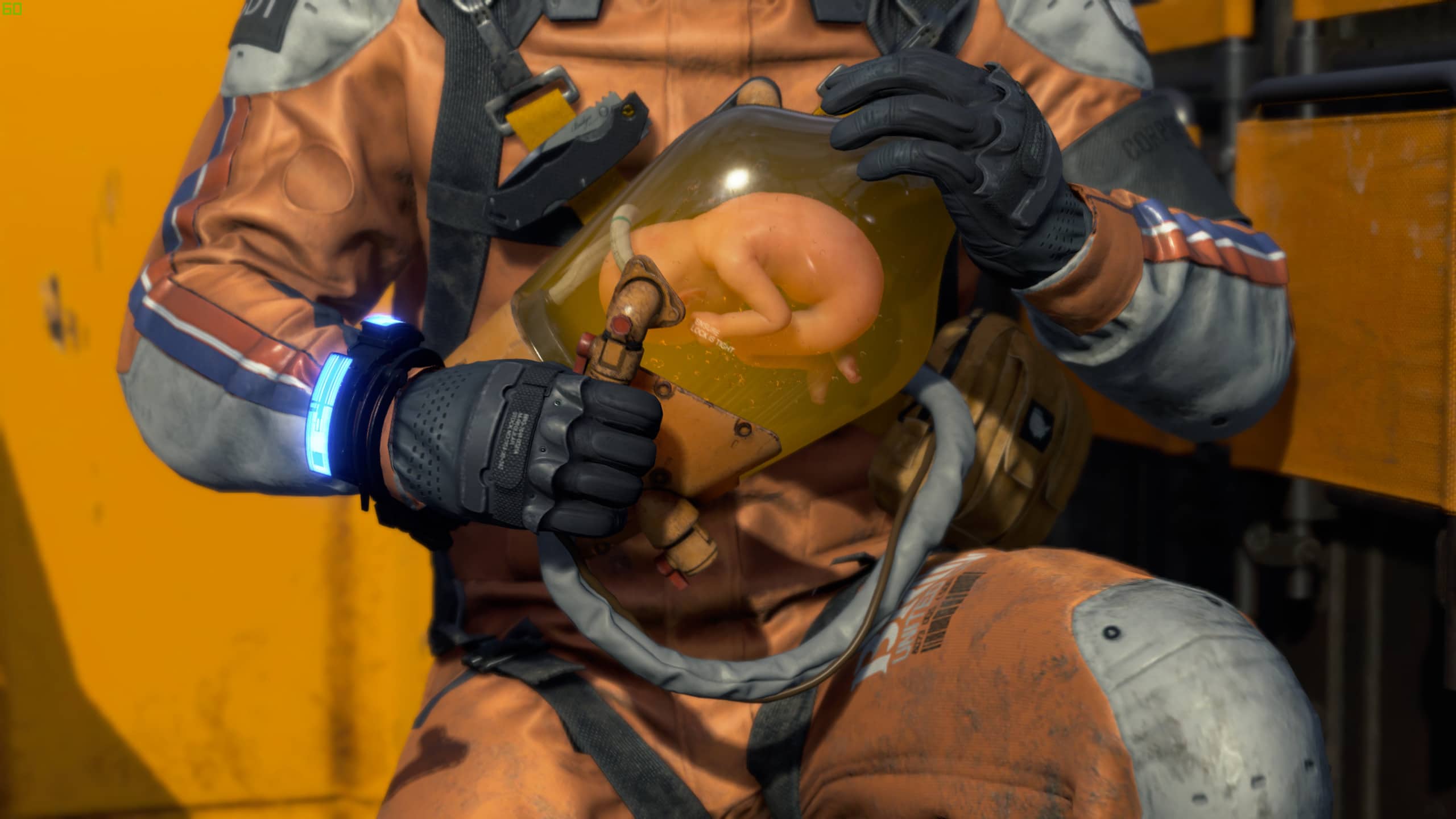 Además de los personajes anteriores, existe uno que es altamente uno de los más llamativos desde que vimos el primer Trailer de Death Stranding. El bebé que Sam casi siempre tiene sobre él, que lleva en un recipiente que se asemeja a un útero artificial.