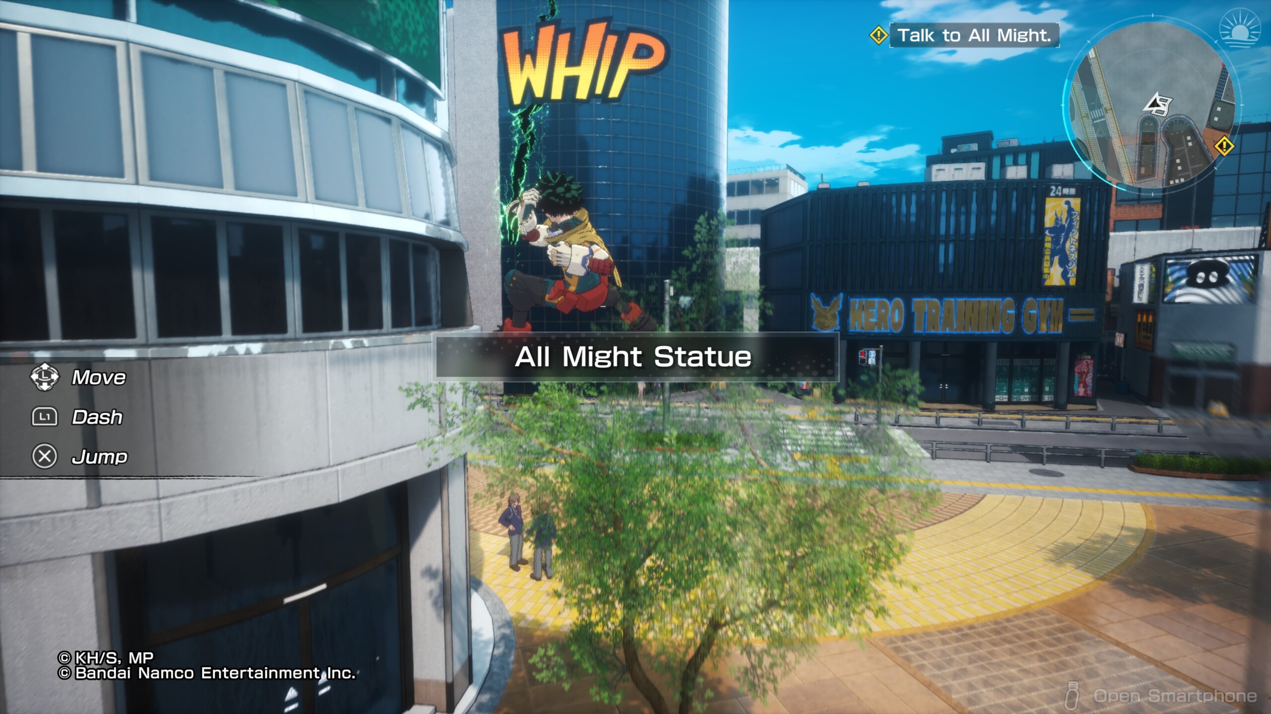 Lo primero que destacamos es que el juego se presenta como un mundo semi-abierto en una ciudad dividida por secciones. Aquí podemos elegir misiones (principales y secundarias), encontrar coleccionables en forma de cartas (un total de 300) y personajes de apoyo, revivir momentos icónicos del anime, y uno que otro minijuego. Esto no solo se hace yendo directamente de un punto a otro, también por medio de un smartphone, pero de eso hablaré más adelante.