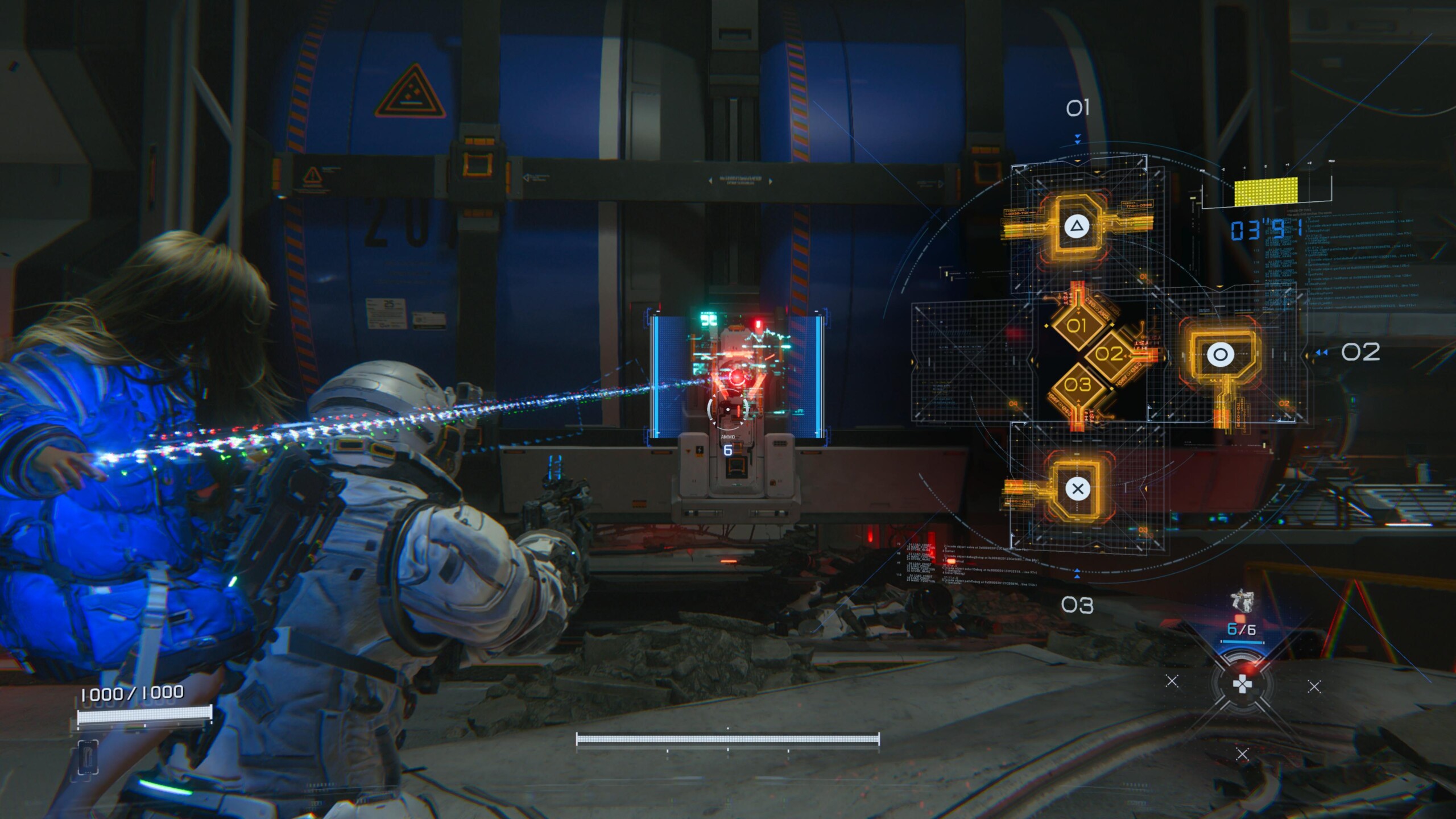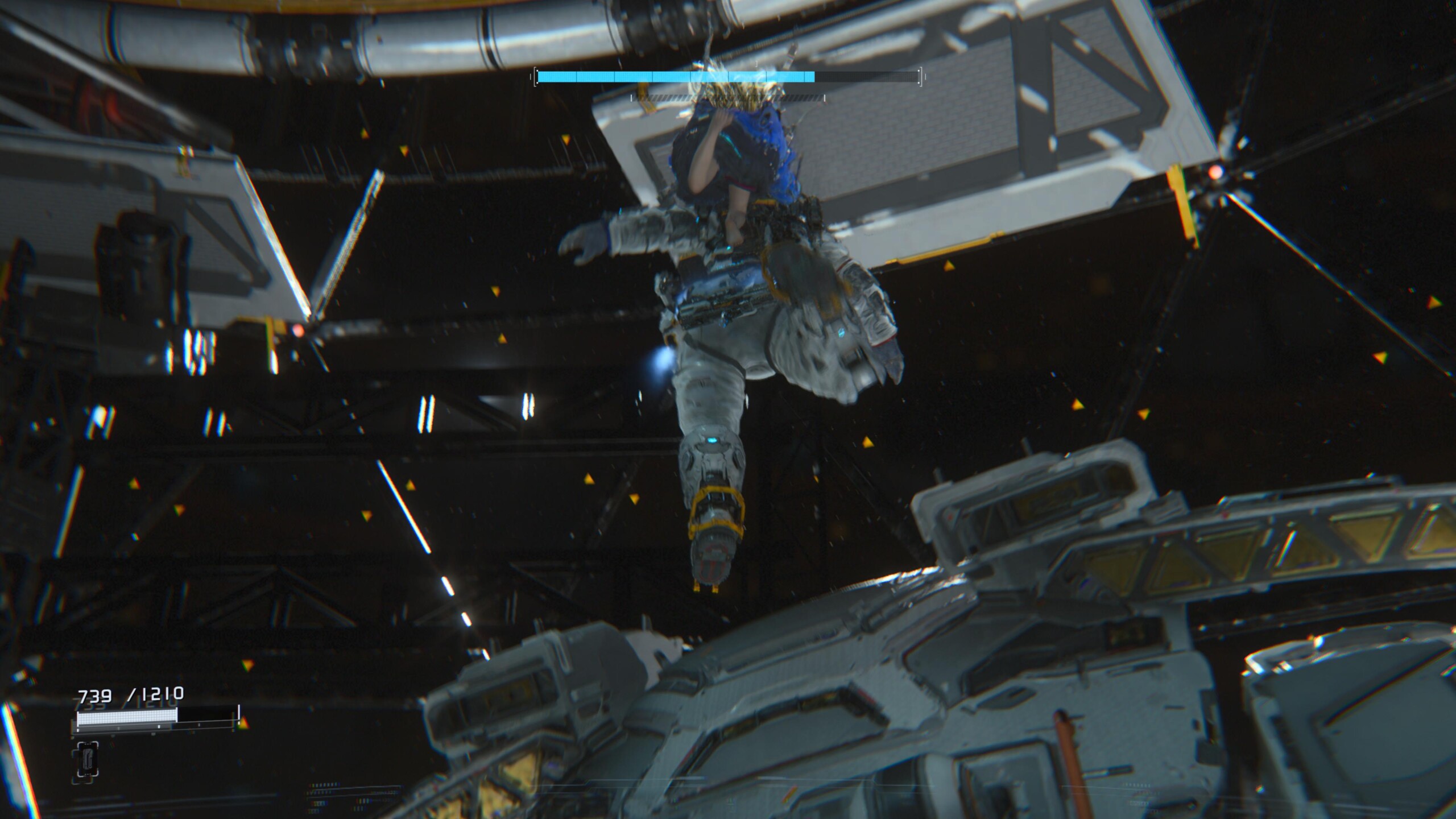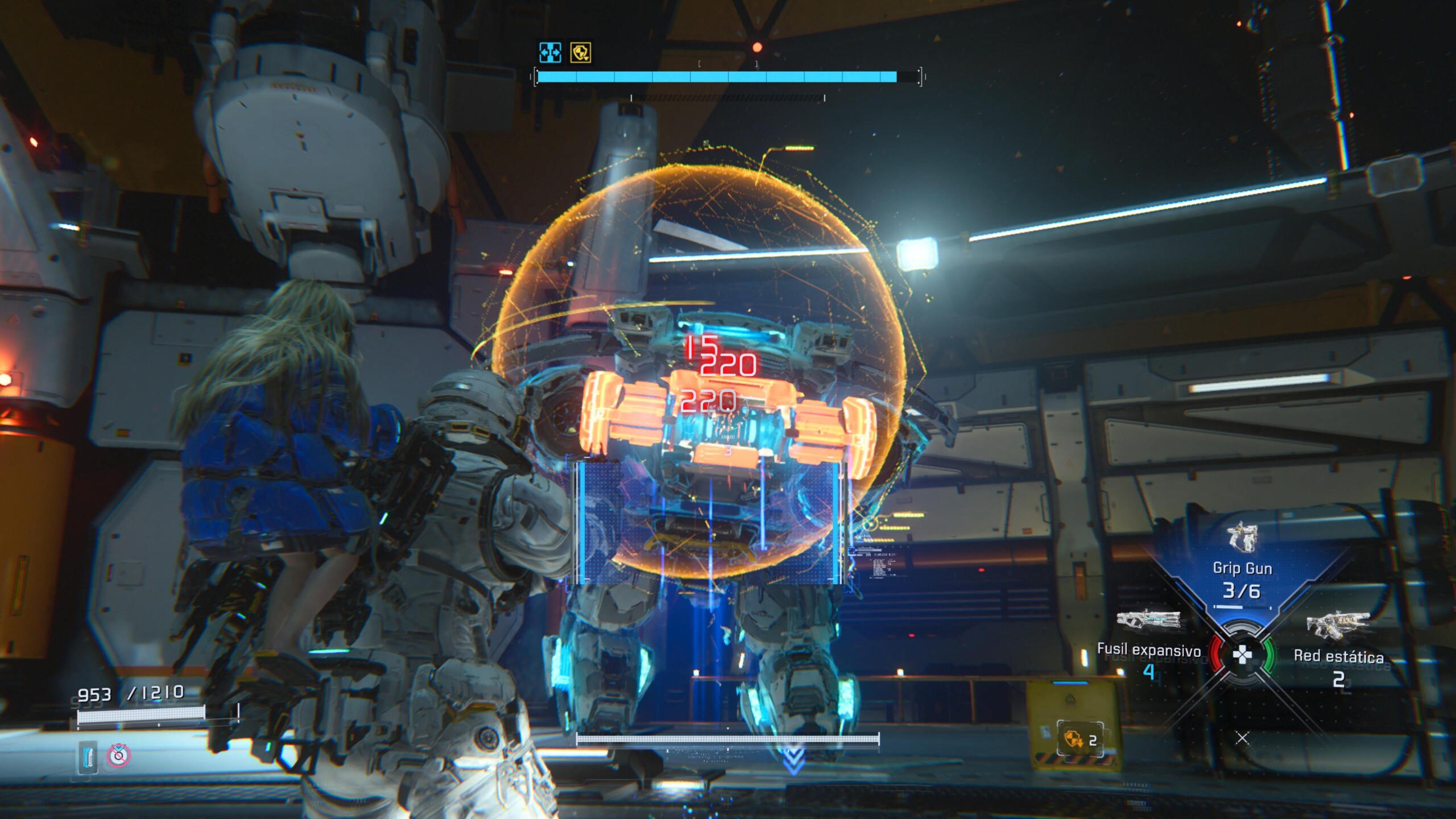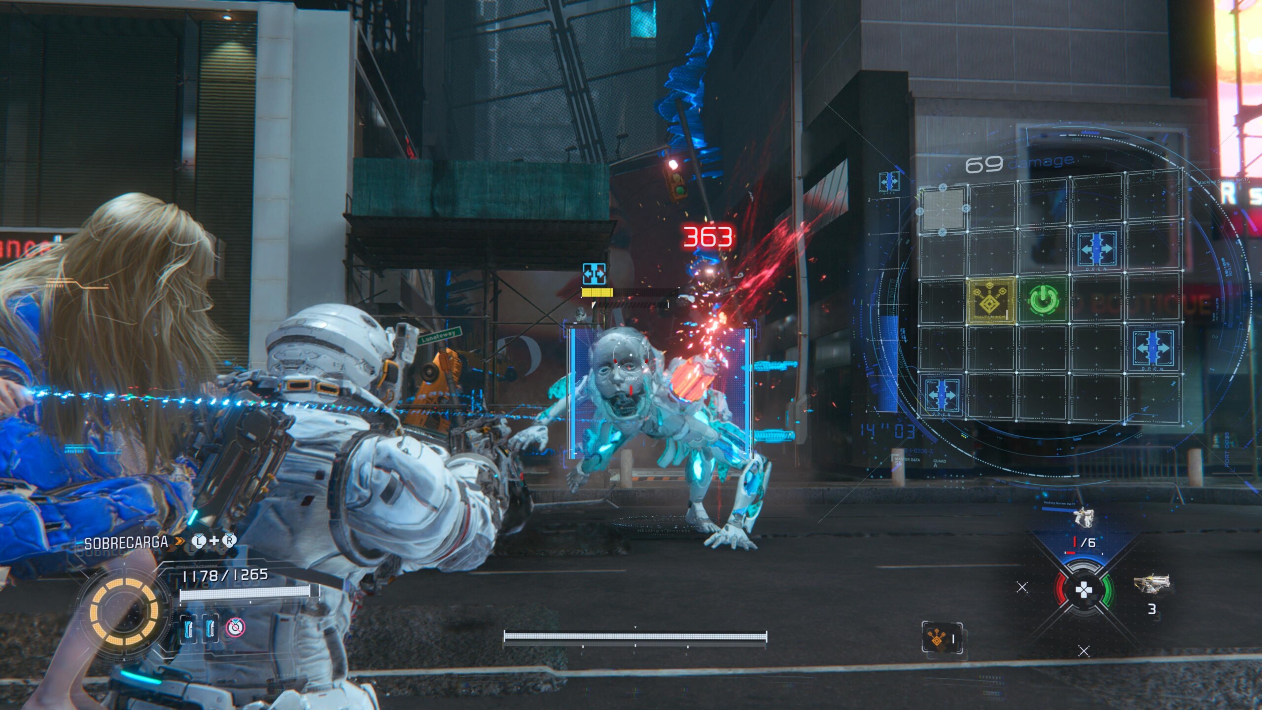 Hugh cuenta con un medidor del propulsor de nuestro traje, que hace las veces de barra resistencia. Sirve para realizar varias acciones como saltar, esquivar y flotar; esquivar en el momento justo evita el daño y ralentiza el tiempo. Además, tendremos a disposición cartuchos de reparación que sirven para reponer salud, y vaya que los vamos a necesitar. Otra mecánica con la que cuenta Diana es el Protocolo de Sobrecarga que consiste en sobrecargar los sistemas de todos los enemigos dejándolos expuestos y recibiendo daño.