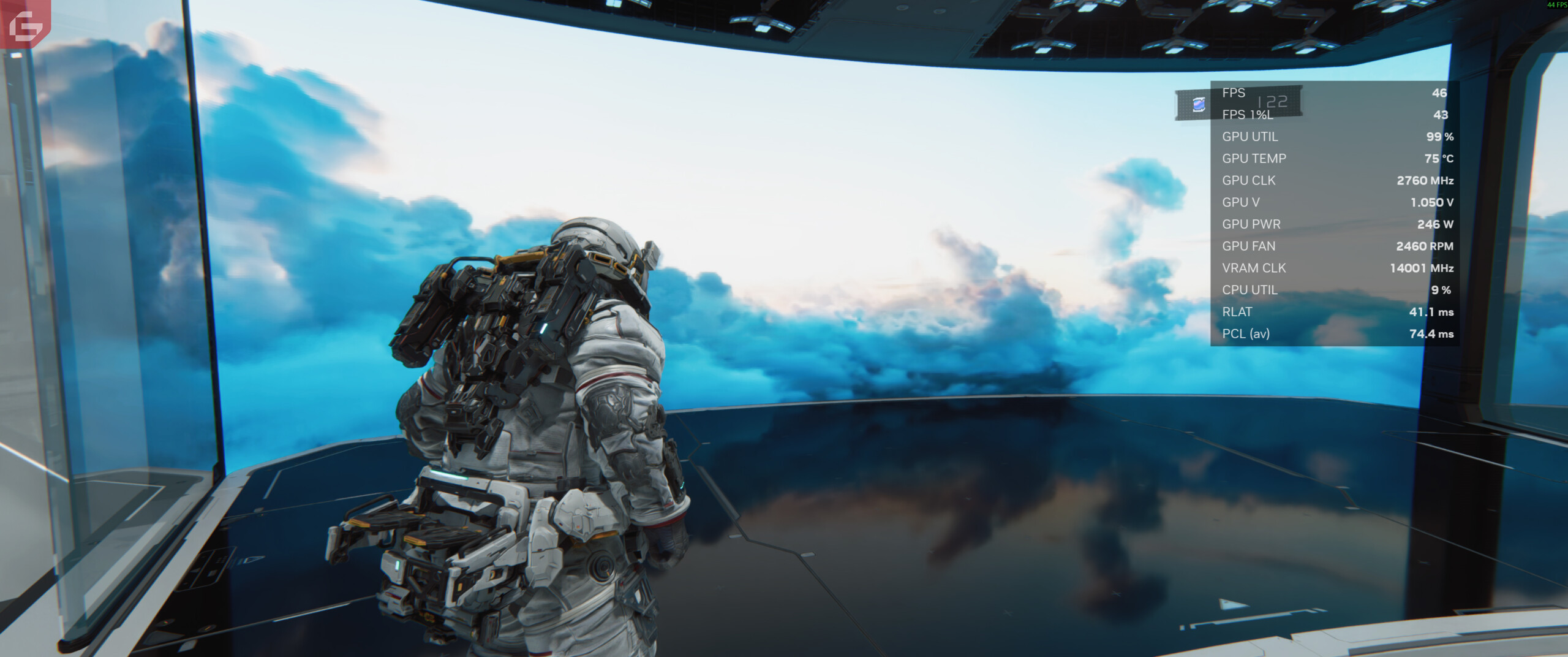 Ahora podemos ver una captura de pantalla con todo el RTX encendido pero sin MFG pero con el DLSS 4 en modo Calidad. Y es más que obvio que apenas podemos alcanzar 48 FPS en pantalla. Aunque para un jugador de consola esto esté dentro de lo aceptable, para mi personalmente 60FPS es mi estándar de cualquier juego para un jugador en PC.