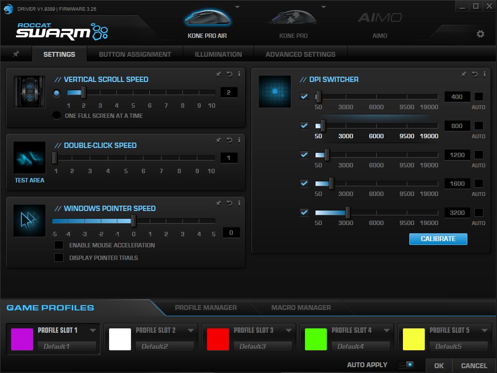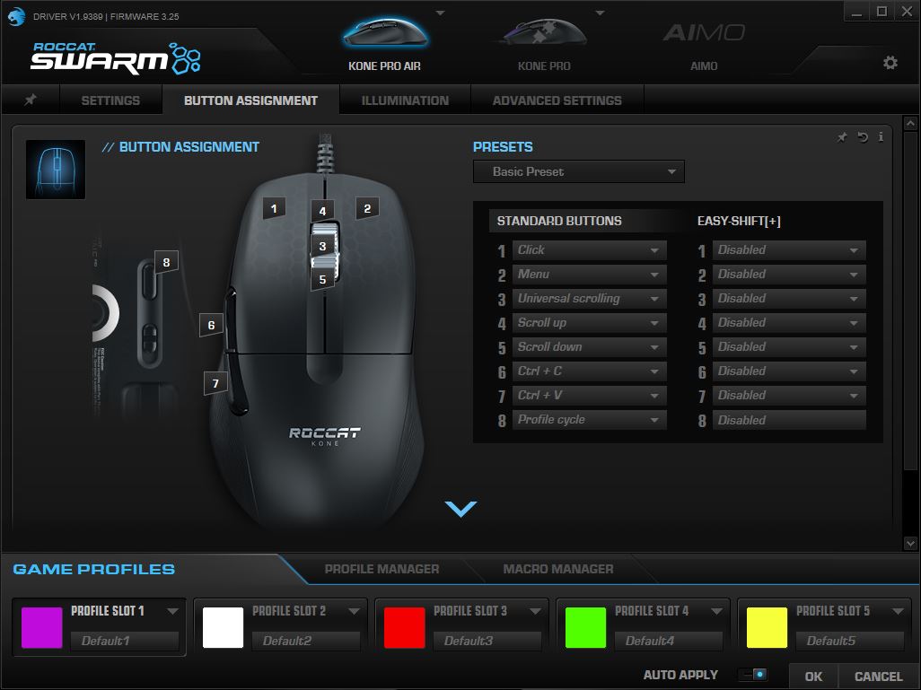 Sobre el RGB de todas las opciones que brinda el software ROCCAT Swarm, es para el goce de una iluminación hermosa a tu escritorio de juego. El ROCCAT Kone Pro Air trae la opción de más de 16.8 millones de colores para dar así una gran combinación deseada. También AIMO te ayudará a que tus periféricos de ROCCAT puedan sincronizar los colores entre sí sobre todo si tienes un teclado Vulcan.
