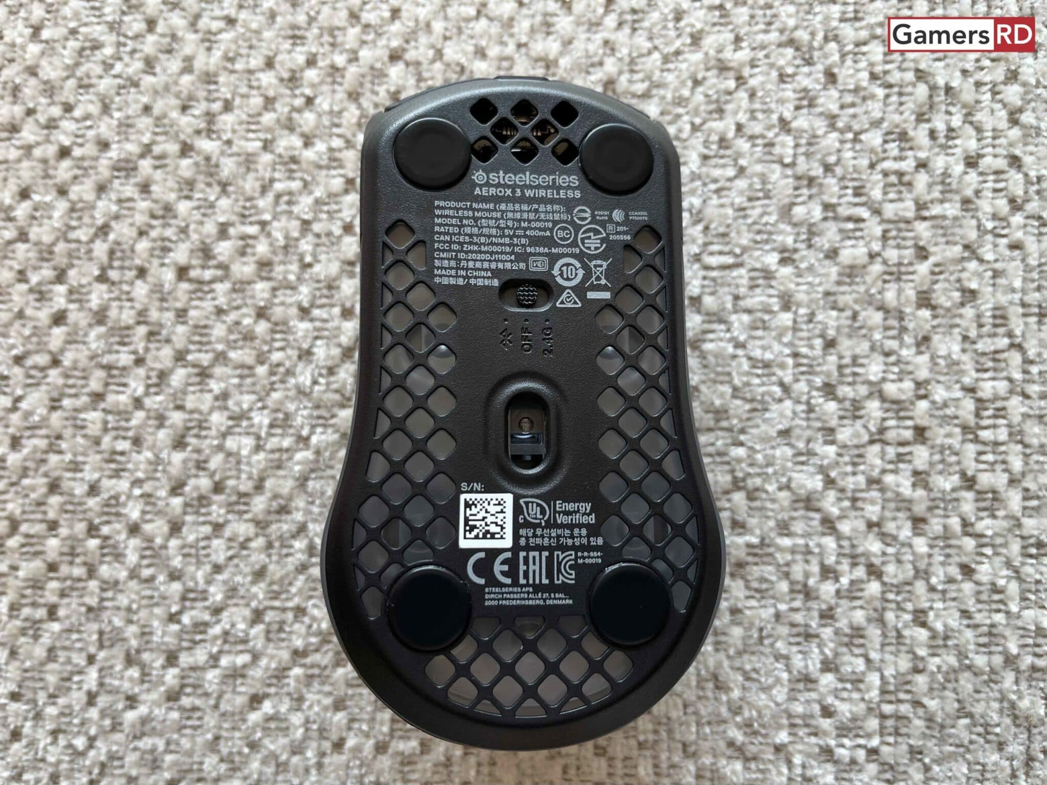 El SteelSeries Aerox 3 Wireless trae seis botones en total: un botón de clic izquierdo, un botón de clic derecho, una rueda de desplazamiento texturizada en la que se puede hacer clic y un selector de sensibilidad de puntos por pulgada (DPI), y trae dos botones de pulgar en el lateral los cuales podemos configurar a nuestro gusto con el software SteelSeries Engine. En la parte inferior del mouse, también hay un selector de entrada, donde se puede configurar el mouse en los modos inalámbricos de 2.4 GHz o Bluetooth como también se puede apagar por completo en caso de que no se vaya a utilizar. También tiene el puerto de carga USB-C en la parte superior. La rueda de desplazamiento es muy buena y tiene como resultado una gran capacidad táctil. Realmente esta rueda es muy cómoda aunque se siente baja en comparación a otros mouse gaming, pero luego de varias horas de uso se hace costumbre usarla.