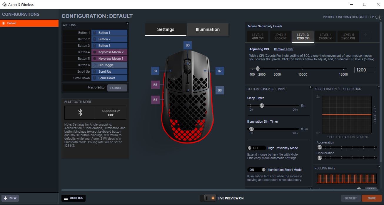 El software SteelSeries Engine trae por defecto 5 niveles de sensibilidad del mouse: Level 1 400CPI, Level 2 800 CPI, Level 3 1200 CPI, Level 4 2400 CPI y finalmente Level 5 3200 CPI. Sin embargo el software da las opciones de poder ajustar el CPI a nuestro gusto e incluso actualizar los 5 niveles de sensibilidad que trae por defecto el software. En mi caso, siempre uso la configuración de 1200 CPI ya que me siento muy a gusto trabajando en la PC e incluso jugando algunos juegos. Aunque si quiero más velocidad lo aumento a 2400 CPI en juegos que requieren un mayor movimiento del mouse. Al ser un mouse muy liviano se debe tomar en cuenta un ajuste entre CPI que se adapte a los giros que vayamos a realizar con este mientras estamos jugando.