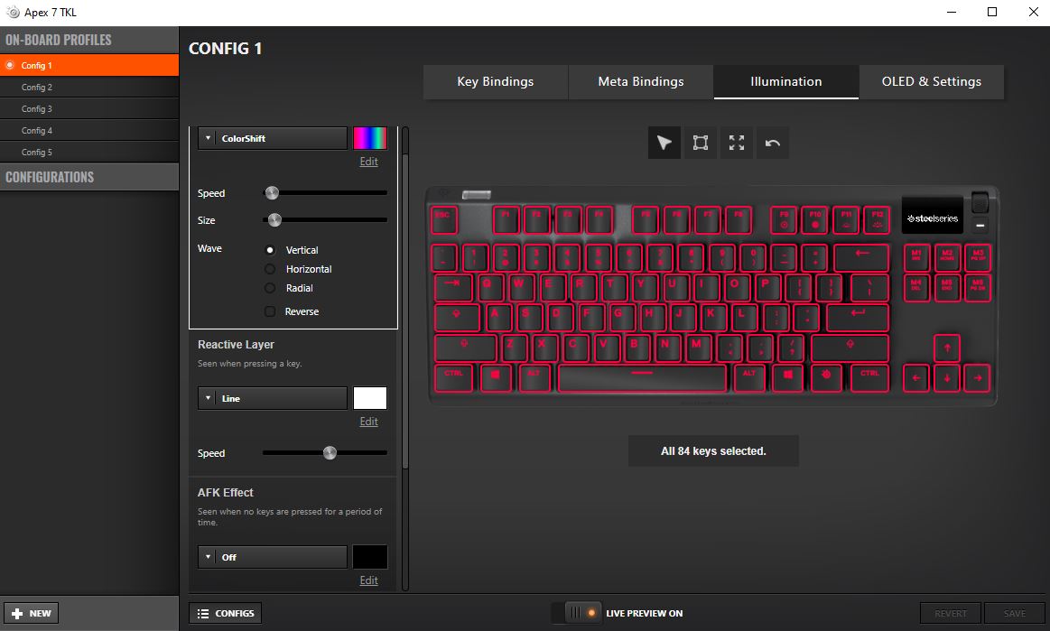 De las cosas más impresionantes del SteelSeries Apex 7 TKL es su iluminación RGB completa y se puede personalizar a través del software SteelSeries Engine, donde cada tecla se puede personalizar individualmente con una luz de fondo que suficientemente brillante para hacer de lujo una combinación perfecta con tu setup gaming. El SteelSeries Engine es el software que combinan todas las funciones frecuentes para los jugadores con el fin de personalizar fácilmente cada tecla y funciones individuales para personalizar el estilo de juego de cada jugador, incluido KLM, administración de múltiples dispositivos como headsets, mouse y teclado, macros de pulsación de teclas, y macros de texto. SteelSeries ha realizado este software para aprovechar al máximo sus periféricos y darle a sus usuarios una gran efectividad a la hora de seleccionar sus colores preferidos o sus efectos en sus periféricos.