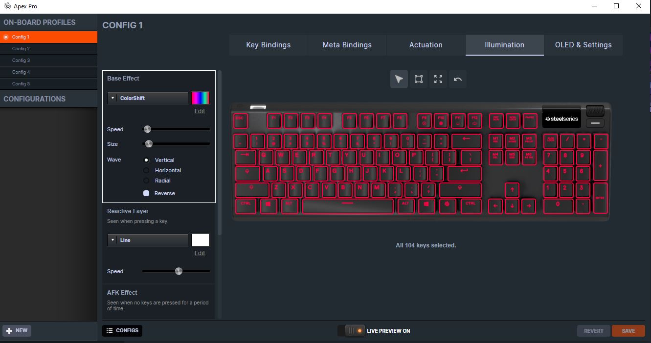 La iluminación RGB del SteelSeries Apex Pro se puede personalizar a través del software SteelSeries Engine, donde cada tecla se puede personalizar individualmente con una luz de fondo que sea suficientemente brillante para hacer de lujo una combinación perfecta con tu setup gaming. El SteelSeries Engine es el software que combinan todas las funciones frecuentes para los jugadores con el fin de personalizar fácilmente cada tecla y funciones individuales para personalizar el estilo de juego de cada jugador, incluido KLM, administración de múltiples dispositivos como headsets, mouse y teclado, macros de pulsación de teclas, y macros de texto. SteelSeries ha realizado este software para aprovechar al máximo sus periféricos y darle a sus usuarios una gran efectividad a la hora de seleccionar sus colores preferidos o sus efectos en sus periféricos.