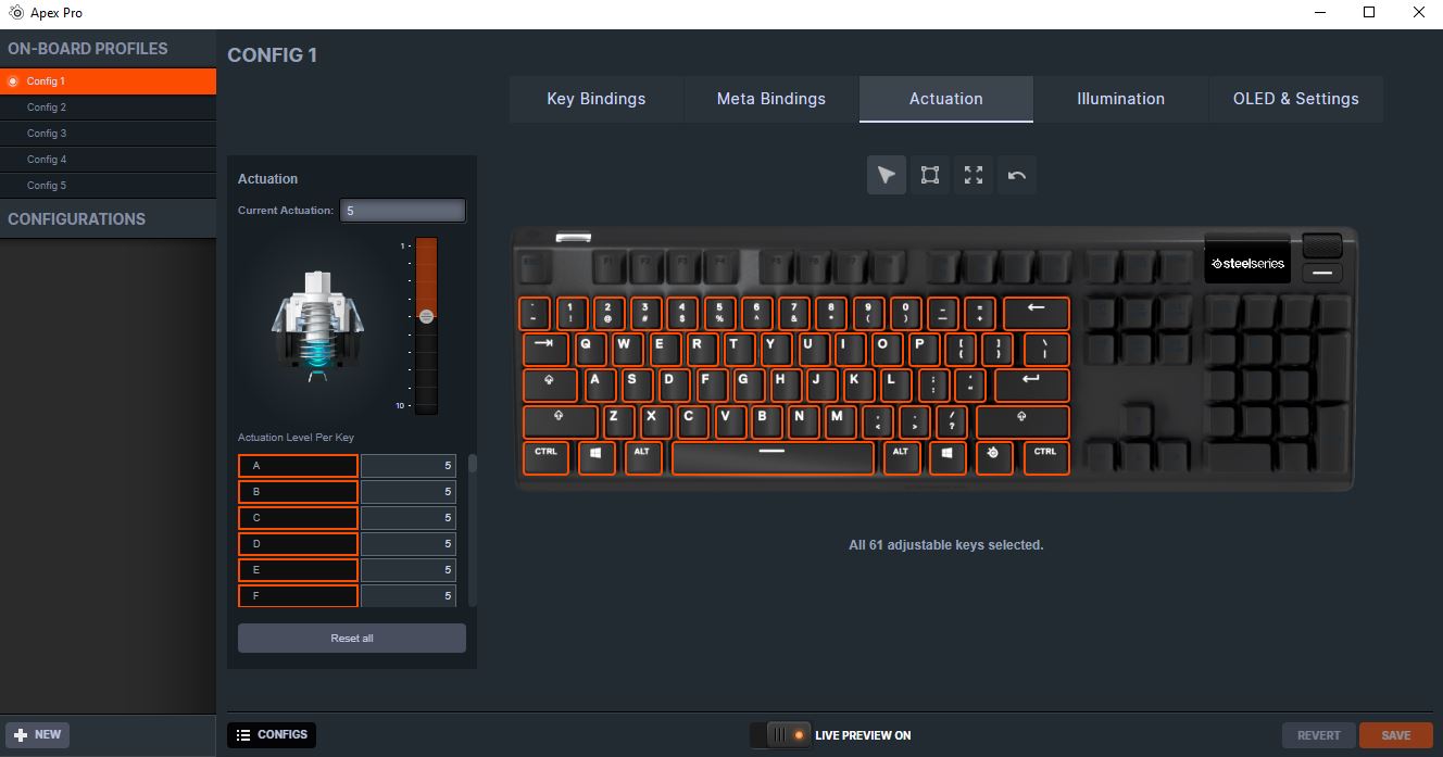 Muchos de los teclados mecánicos traen diferentes tipos de interruptores de los cuales pueden variar según la preferencia del usuario, los más comunes son los Cherry MX. Sin embargo, el SteelSeries Apex Pro no solo presenta una construcción robusta y elegante, con poco o ningún espacio desperdiciado, sino también nuevos interruptores magnéticos OmniPoint (que significa «todos los puntos») que el usuario puede ajustar. Puedes personalizar la activación de la mayoría de las teclas de este teclado, marcando exactamente cómo quieres que se sienta tu experiencia de escritura y en el juego. Los interruptores OmniPoint tienen la sensación suave y lineal de los interruptores mecánicos rojos. El ajuste del punto de actuación afecta cuando el teclado registra la pulsación de la tecla, pero no cómo se siente físicamente la tecla bajo los dedos. Cada tecla recorre la misma distancia cuando toca fondo en cualquier punto de actuación.