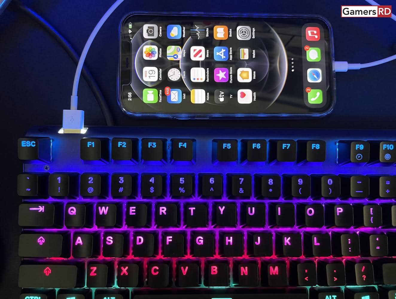 Las tapas de las teclas están elevadas por encima de la plataforma del teclado, lo que le da al teclado una estética muy moderna y limpia, sintiéndose sólidas y de calidad premium. En la parte posterior del teclado, se encuentra un puerto de conexión USB que se está iluminado, por lo que es fácil de encontrar incluso por si necesitamos conectar algún periférico y hasta nuestro celular para cargarlo. Sin embargo, debido a que existe una conexión USB, este teclado requiere dos puertos USB para la alimentación. También el marco tiene canales incorporados que le permiten elegir uno de los tres lugares posibles para que salga el cable, manteniendo su escritorio ordenado y sin complicaciones.