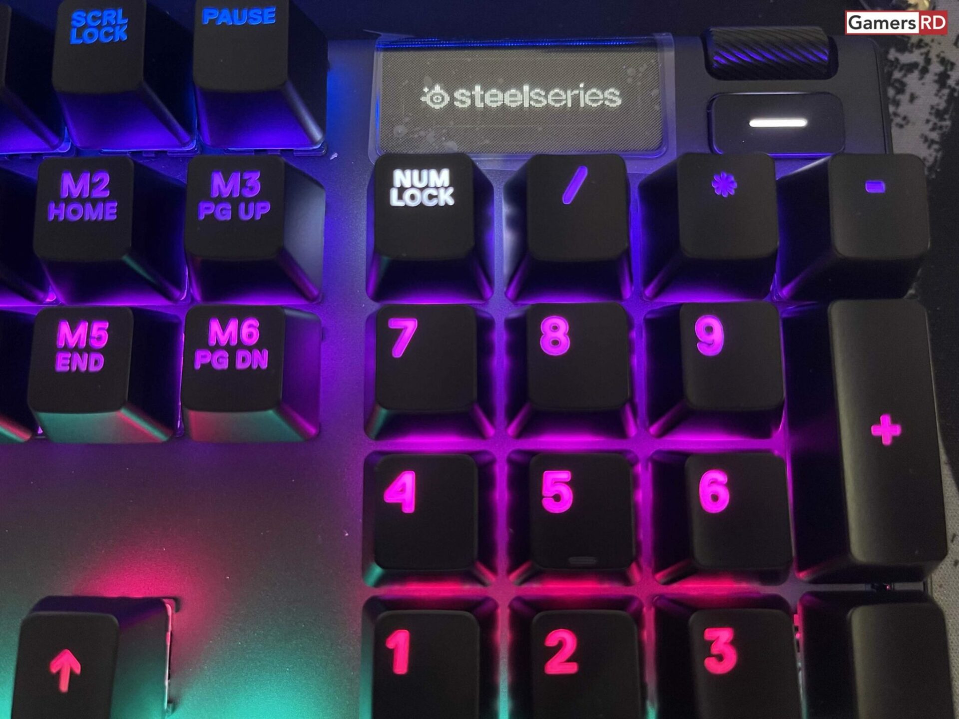 El SteelSeries Apex 7 Pro tiene teclas de control de medios dedicadas, y todas las teclas son macro programables directamente en el teclado o con el software SteelSeries Engine. La rueda controla los controles de volumen y proporciona navegación para la pantalla OLED “128×40” del teclado mientras se mantiene presionado el botón de menú. Esta pantalla OLED le permite cambiar configuraciones y perfiles sin minimizar los juegos, o puede personalizarla en ciertos juegos para mostrar información como las proporciones K / D y entre otras cosas más, también podrás colocarle un logo deseado o inclusive una imagen JPG o GIF. Pero esto no es todo, también puedes programar la pantalla para ver la temperatura y consumo de tu CPU, GPU, Memoria RAM y más! Esto realmente es algo que se le puede sacar mucho beneficio a la hora de monitorear tu PC y sus componentes. SteelSeries diseñó claramente este teclado teniendo en cuenta los eventos donde podrás cargar perfiles y cambiarlos sobre la marcha, y no existe ninguna demora entre el cambio de perfil. Todo es instantáneo e incluso puedes configurar el teclado para cargar perfiles según el juego y así ganamos tiempo cuando deseamos ejecutar esta acción.