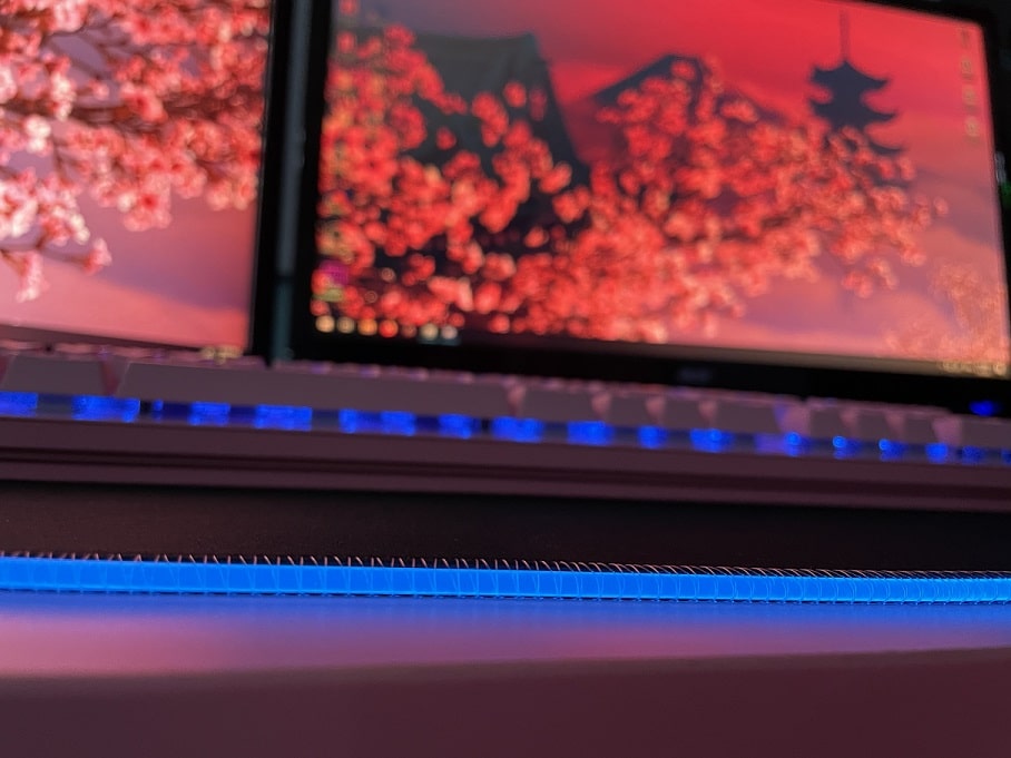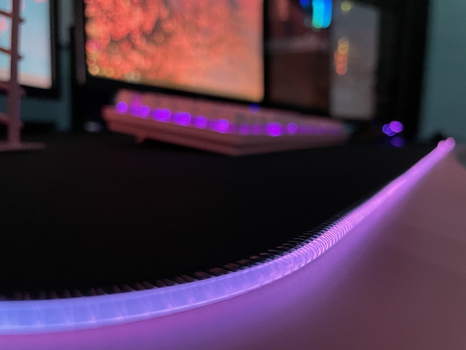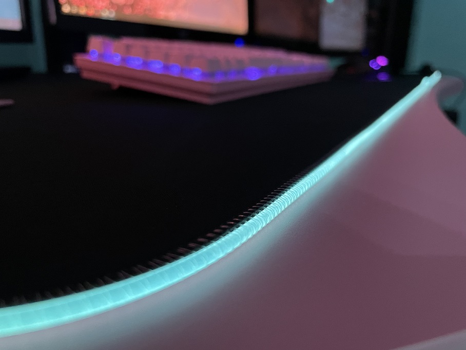 Por otro lado, todo el borde posee un tubo plástico cosido, el cual proporciona la iluminación RGB. Puedo decir que personalmente tenía la duda acerca de los mousepad con RGB, al pensar que el borde LED resultaría molestoso si resaltase sobre la dimensión del grosor de la tela. Si tienen esta misma duda, déjenme aclararles que el borde RGB del “QcK Prism Cloth 3XL” no causa ninguna molestia en la muñeca al momento en que utilizamos el mouse. Esto es debido a que, las dimensiones del grosor del mousepad son las mismas que el borde led, lo que hace que sea cómodo al roce con nuestra muñeca o antebrazo.