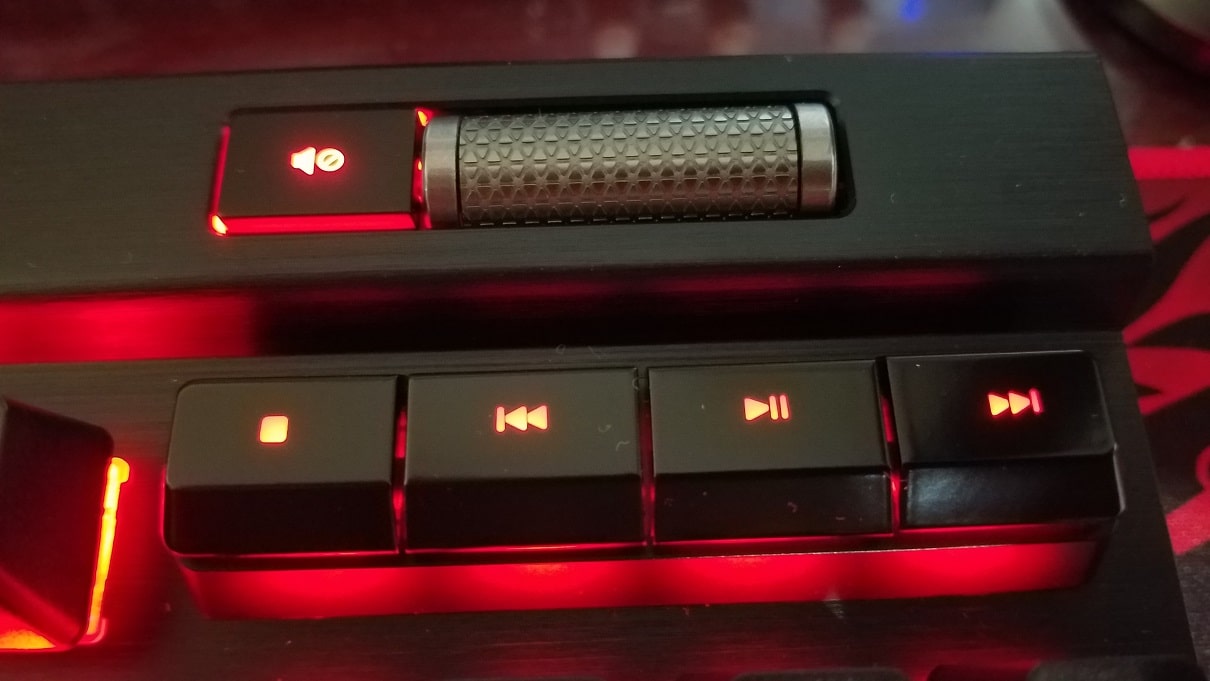 A esto se agrega lo que por supuesto no podía faltar. 6 botones macro a la izquierda del teclado y un controlador multimedia encima del panel numérico. Adicional, tenemos la nueva implementación de una rueda multimedia con push button programable que nos permite controlar de manera autónoma una serie de parámetros que anteriormente solo podían accesar a través del software iCUE.