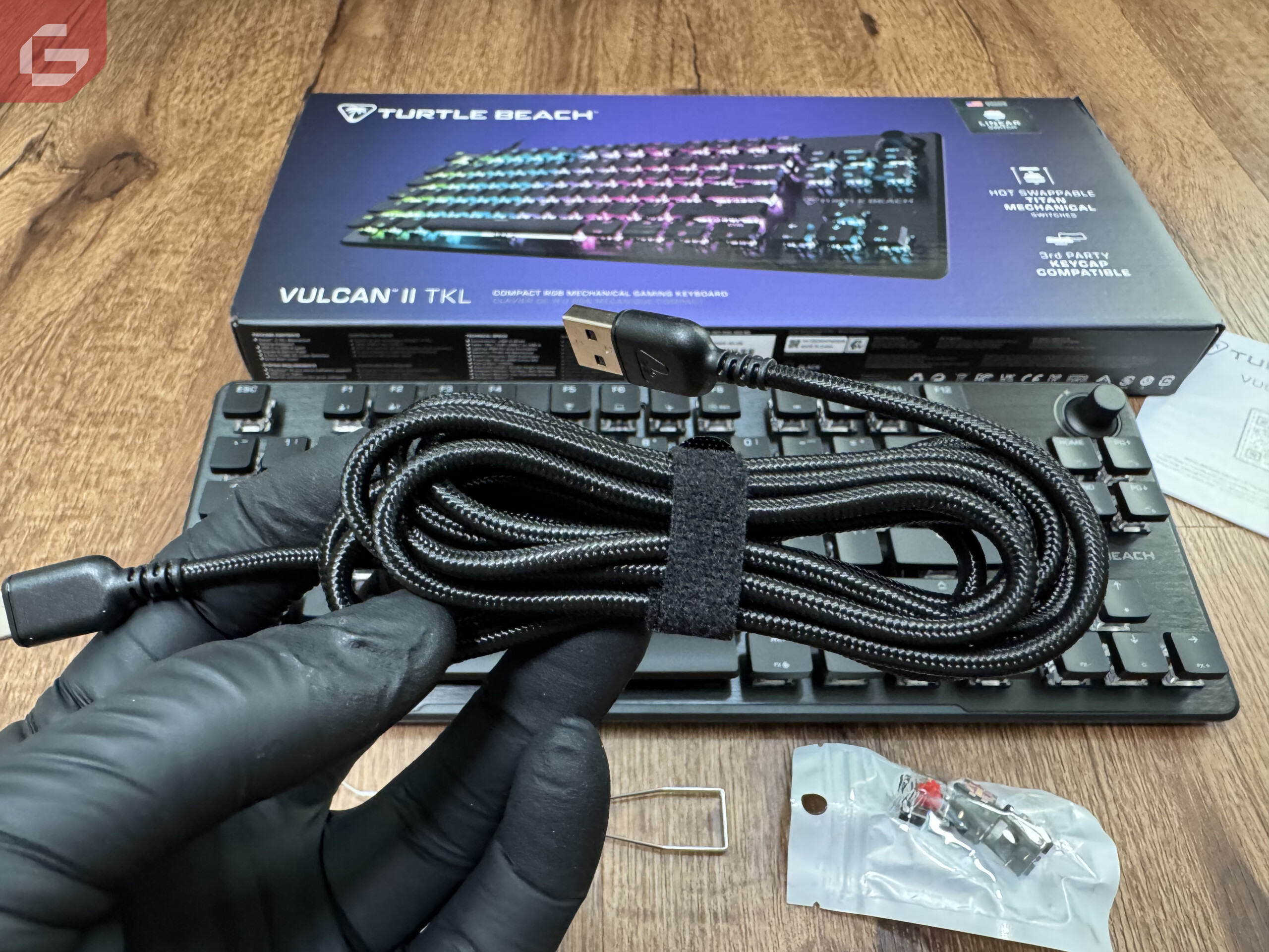 Este nuevo teclado gaming tiene una gran versatilidad ya que no solamente a la hora de jugar es útil sino en todo momento. Dentro de la caja viene incluido un cable trenzado USB-C, varios ejemplos de switches y la herramienta para hacer los cambios necesarios. Obviamente también tenemos nuestro manual para entender un poco más de las mecánicas del teclado.